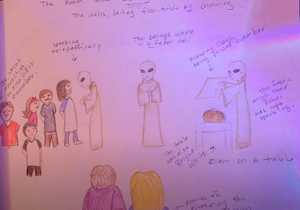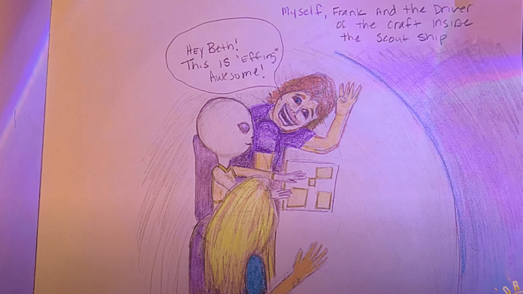 After consenting, Beth was transported onboard a scout ship with a small, grey-looking being who was driving the craft as well as her friend Frank, who waved at her and yelled, “this is fucking awesome!”