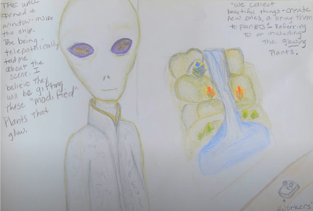 Subsequently, another being telepathically invited Beth to look at a different portion of the ship where she saw a gorgeous waterfall and bountiful garden replete with bioluminescent plants.